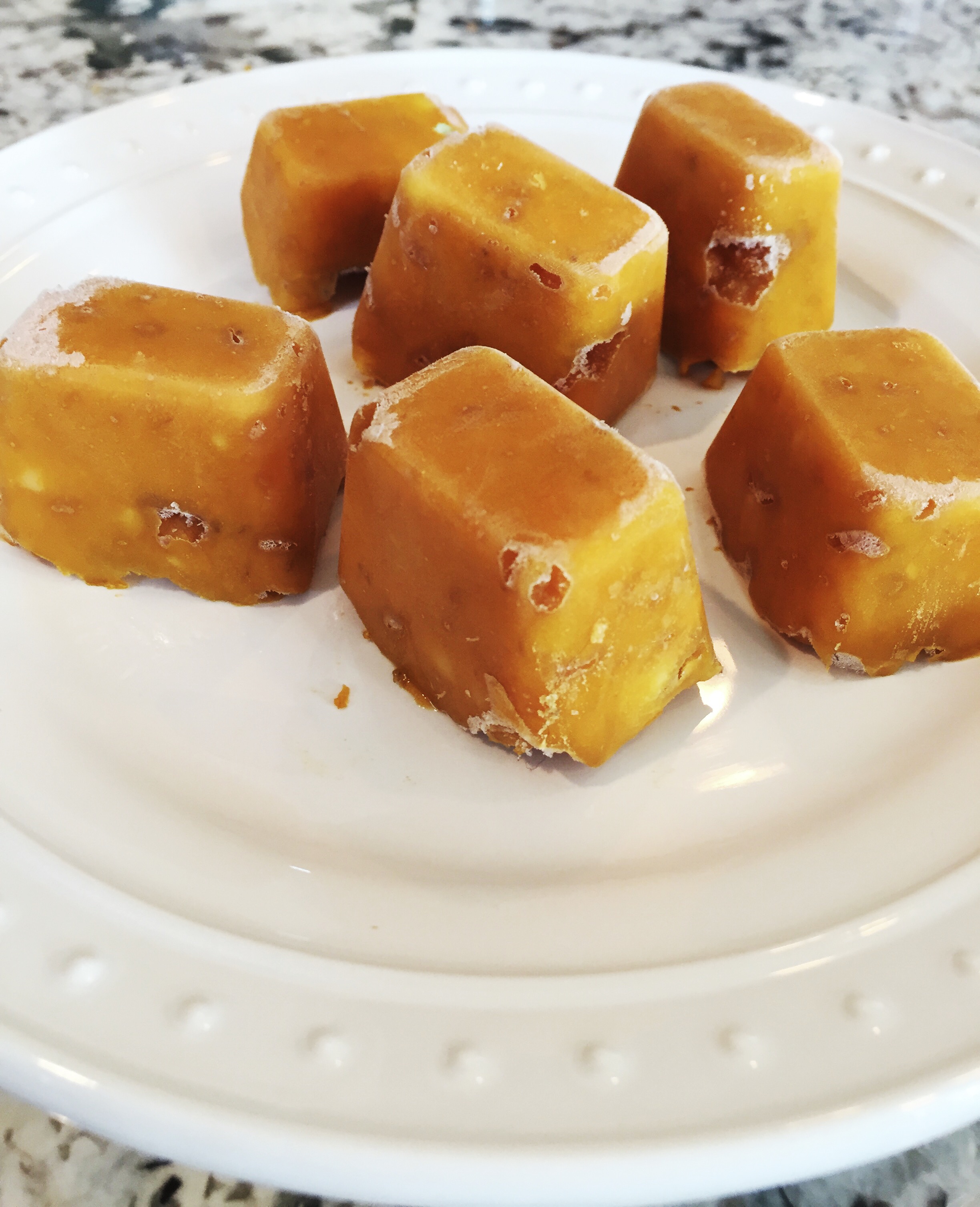 4.Once mashed and mixed to a consistency you like, add the mixture to the ice cube tray and freeze.5.Let freeze for a few hours, serve one a day, or every other day!