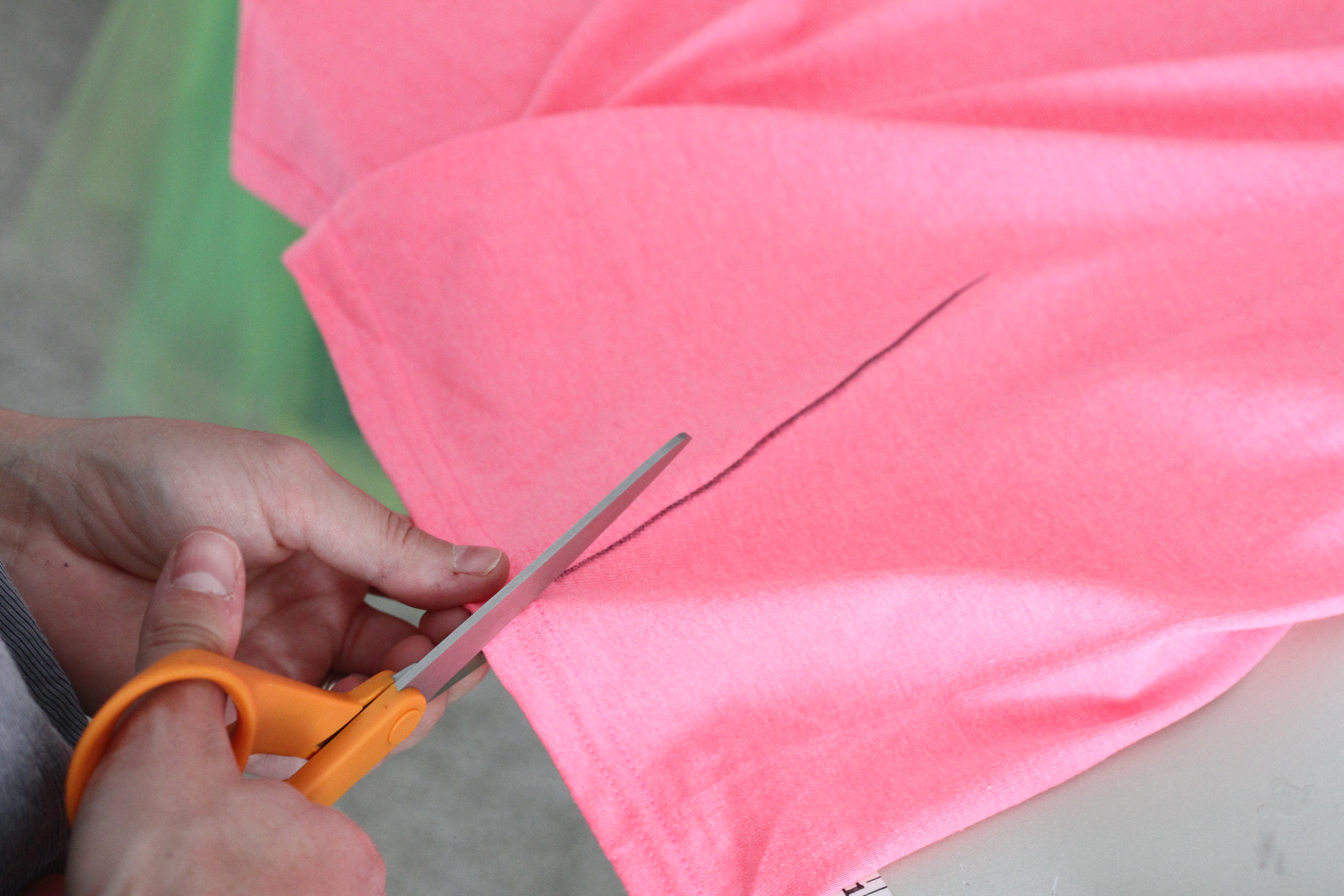 2.Cut in a 4-5 inch line on either side of the cut area so you can tie these pieces of fabric together so the shirt fits better and doesn’t drag underneath your dog