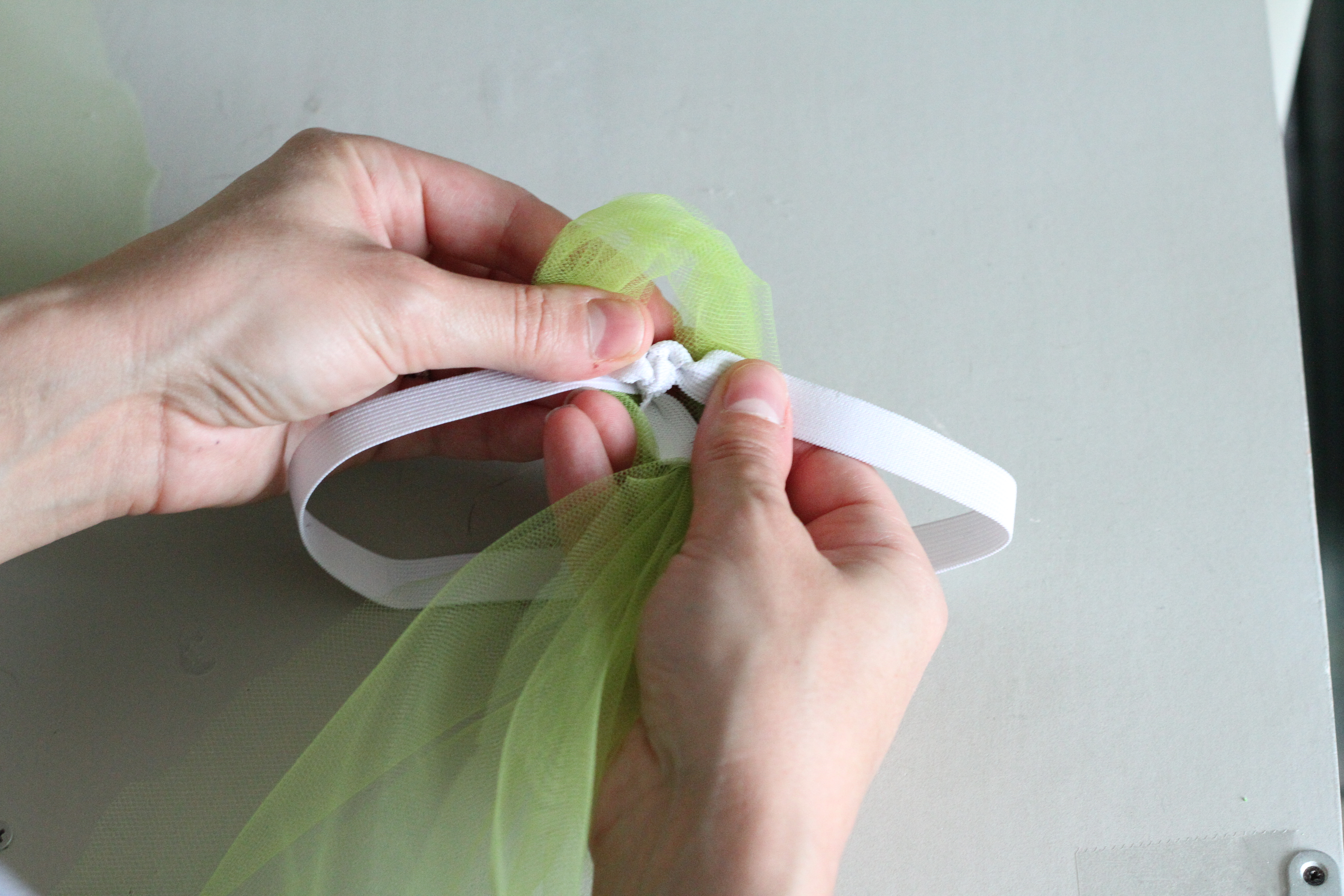 12. And here is my no sew no glue hack for applying the tulle to the elastic to create the tutu! Take your tulle piece and fold it in half. Place the folded tulle under the elastic band and create an opening at the fold. Take the rest of the tulle piece and put it through the opening to create a knot. Pull it all the way through to tighten.