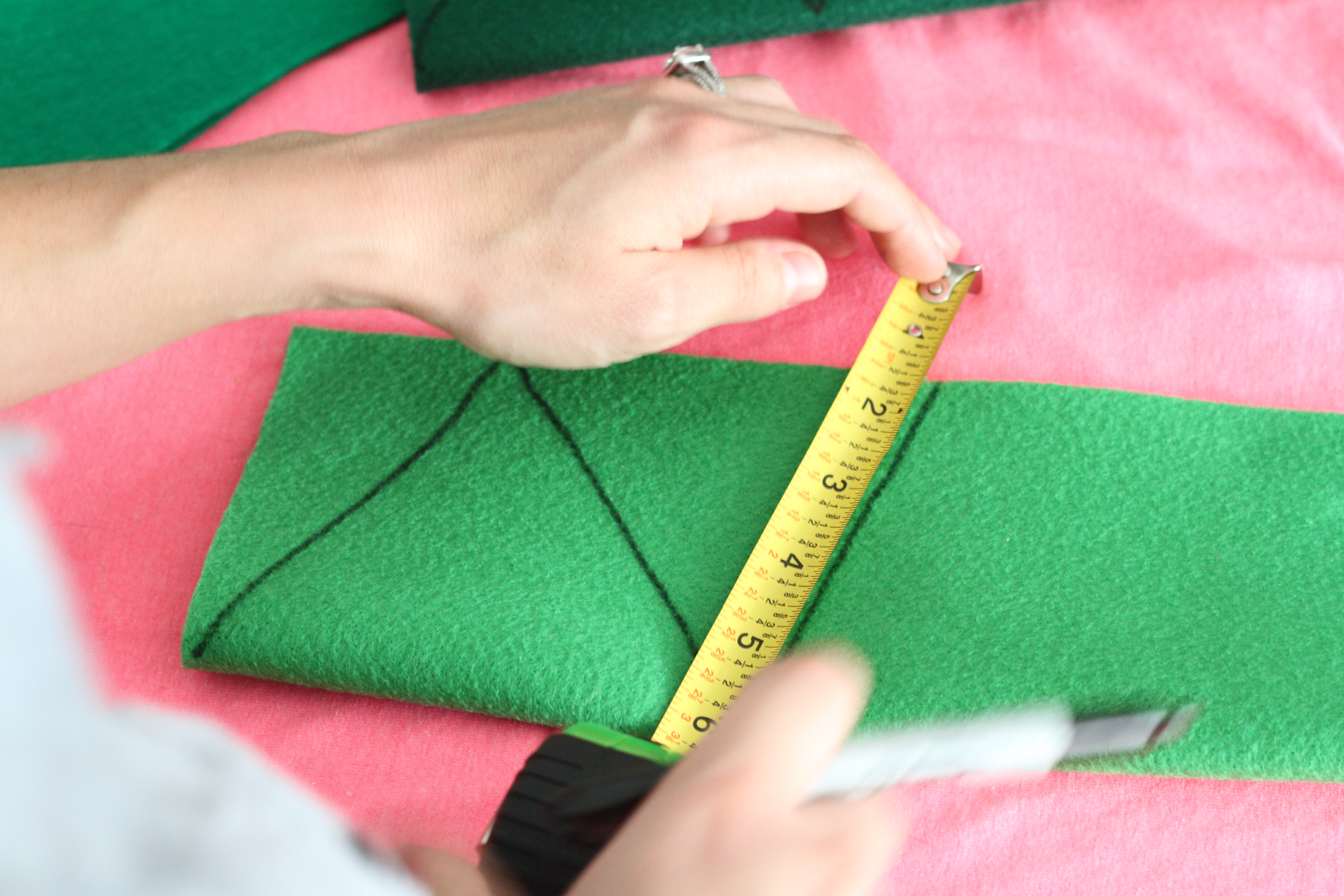 4.Fold the felt squares in half and take out your tape measure and sharpie