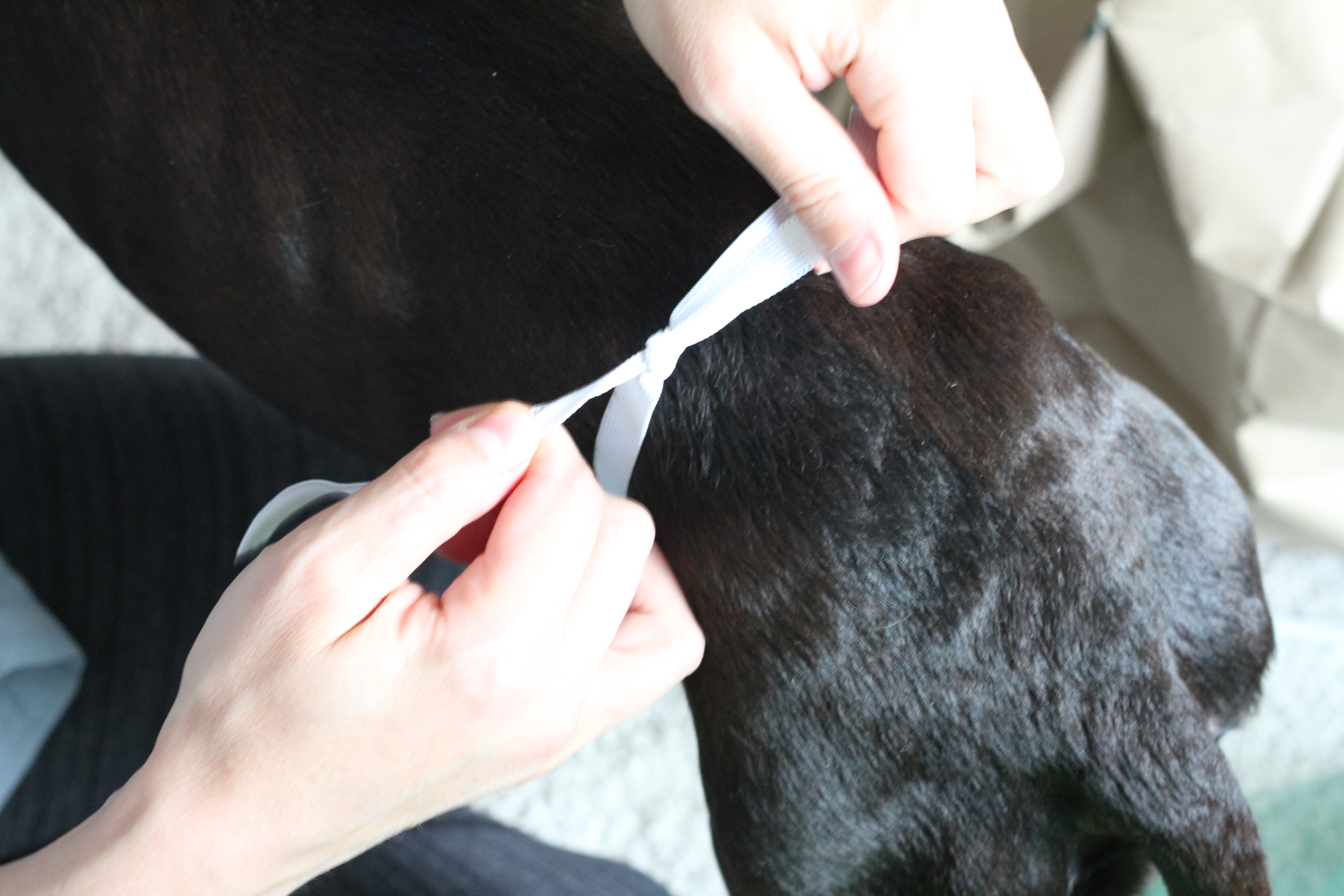13. Repeat around half the elastic band so there isn’t a bunch of tulle under your dog’s belly