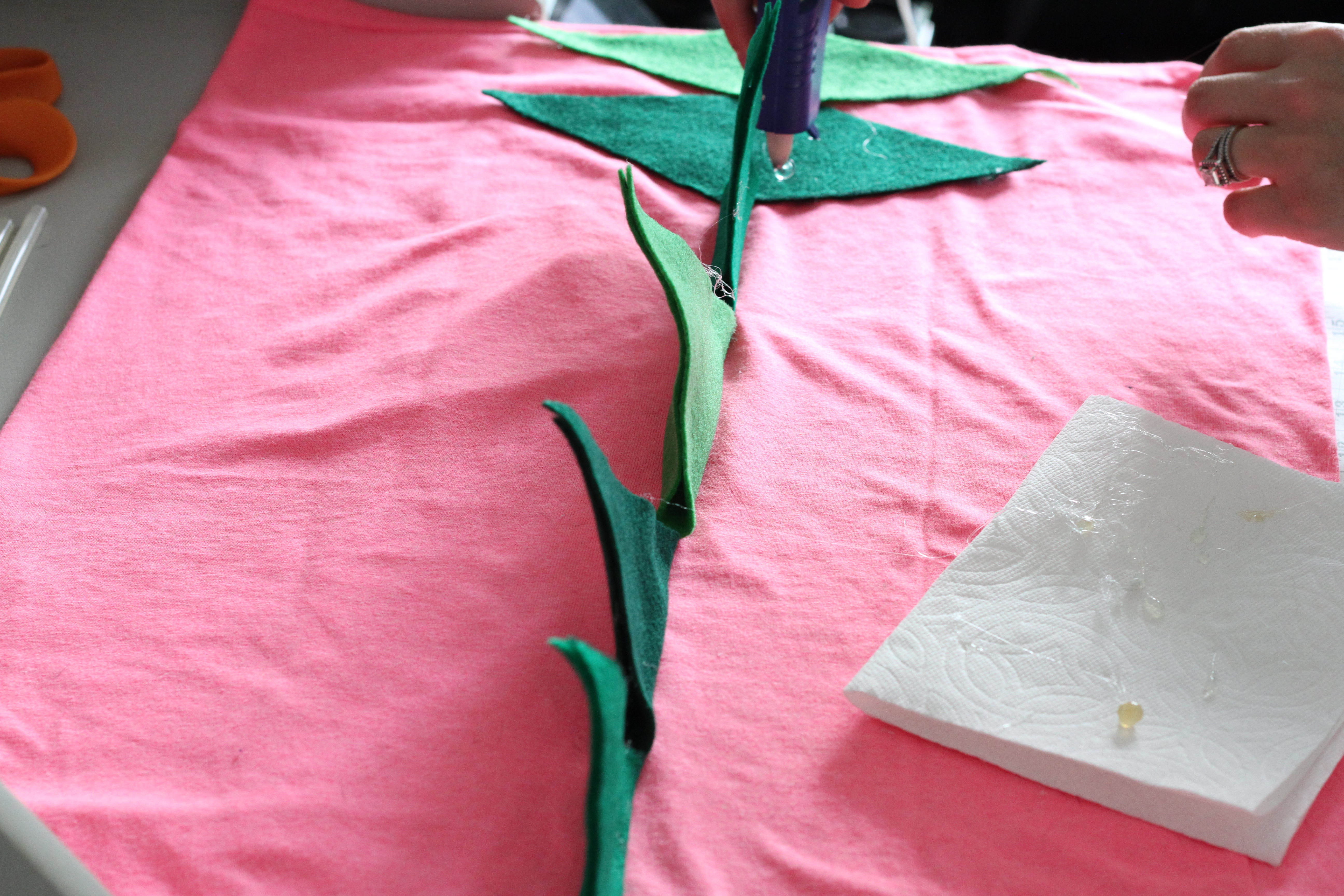 9.Once each felt spike is glued down to the tshirt at the fold, place glue on each side of felt spike and fold up to create the standing dinosaur spike