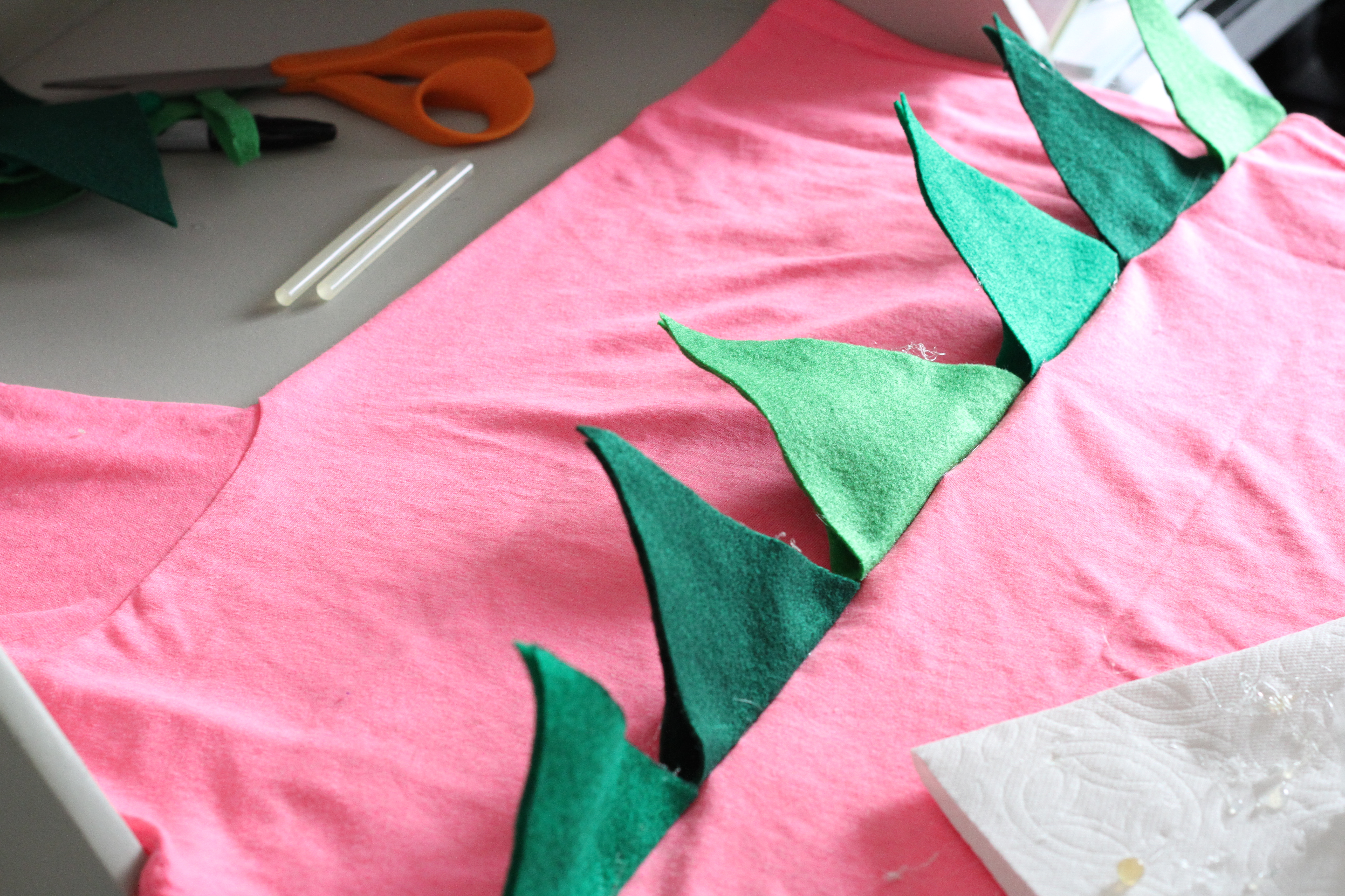 8.Take each of the felt spikes one by one and glue them at the underside of the fold to the shirt