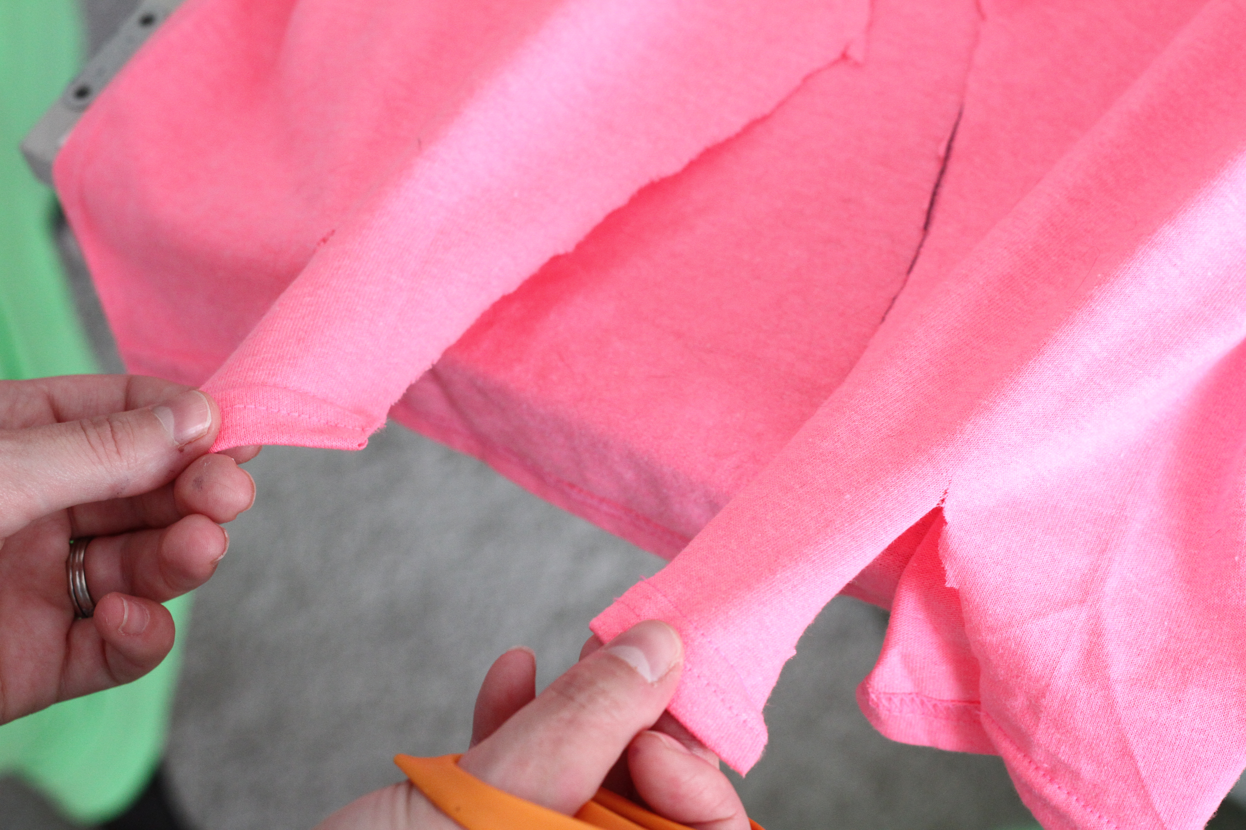 2.Cut in a 4-5 inch line on either side of the cut area so you can tie these pieces of fabric together so the shirt fits better and doesn’t drag underneath your dog