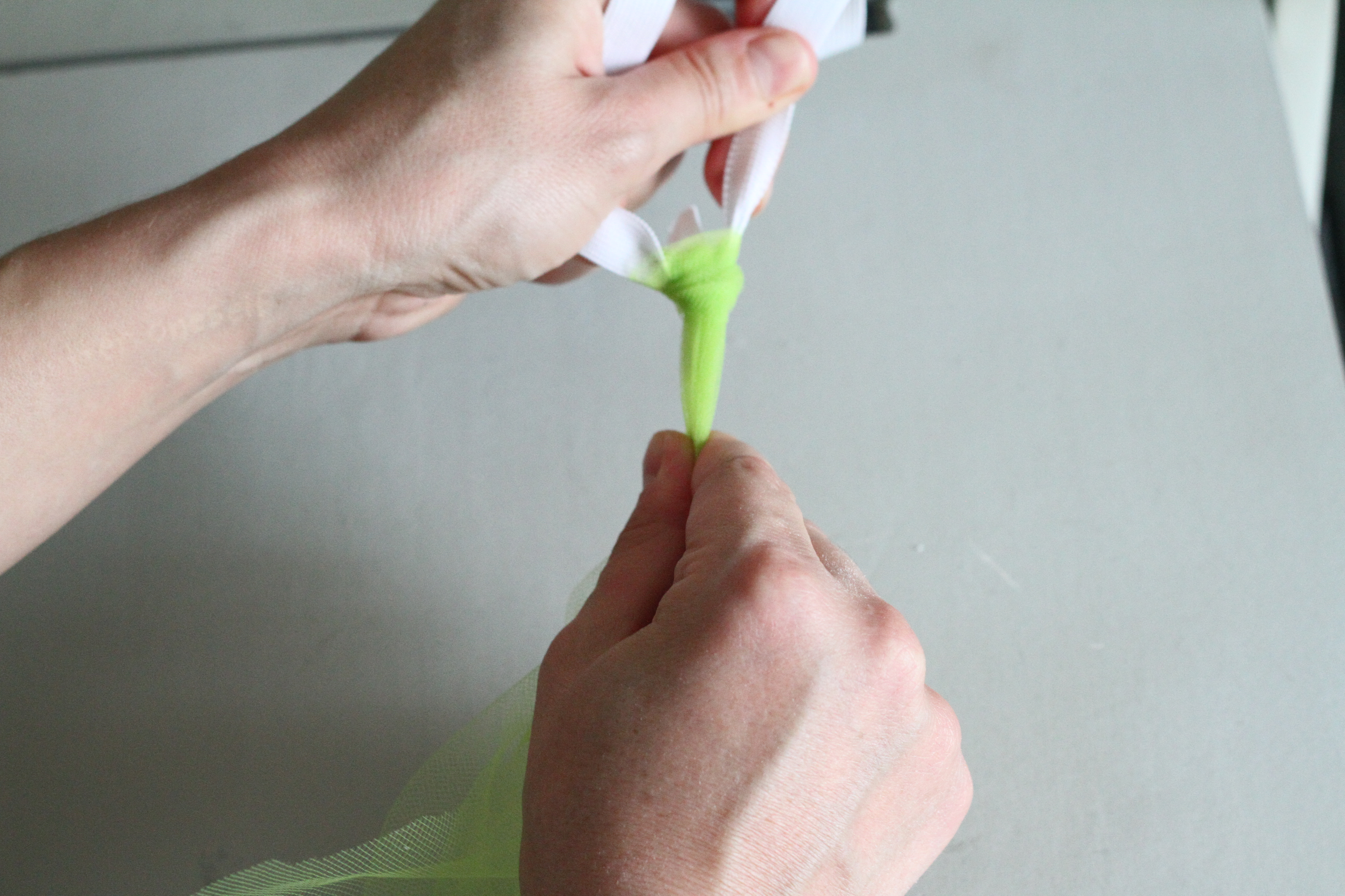 12. And here is my no sew no glue hack for applying the tulle to the elastic to create the tutu! Take your tulle piece and fold it in half. Place the folded tulle under the elastic band and create an opening at the fold. Take the rest of the tulle piece and put it through the opening to create a knot. Pull it all the way through to tighten.