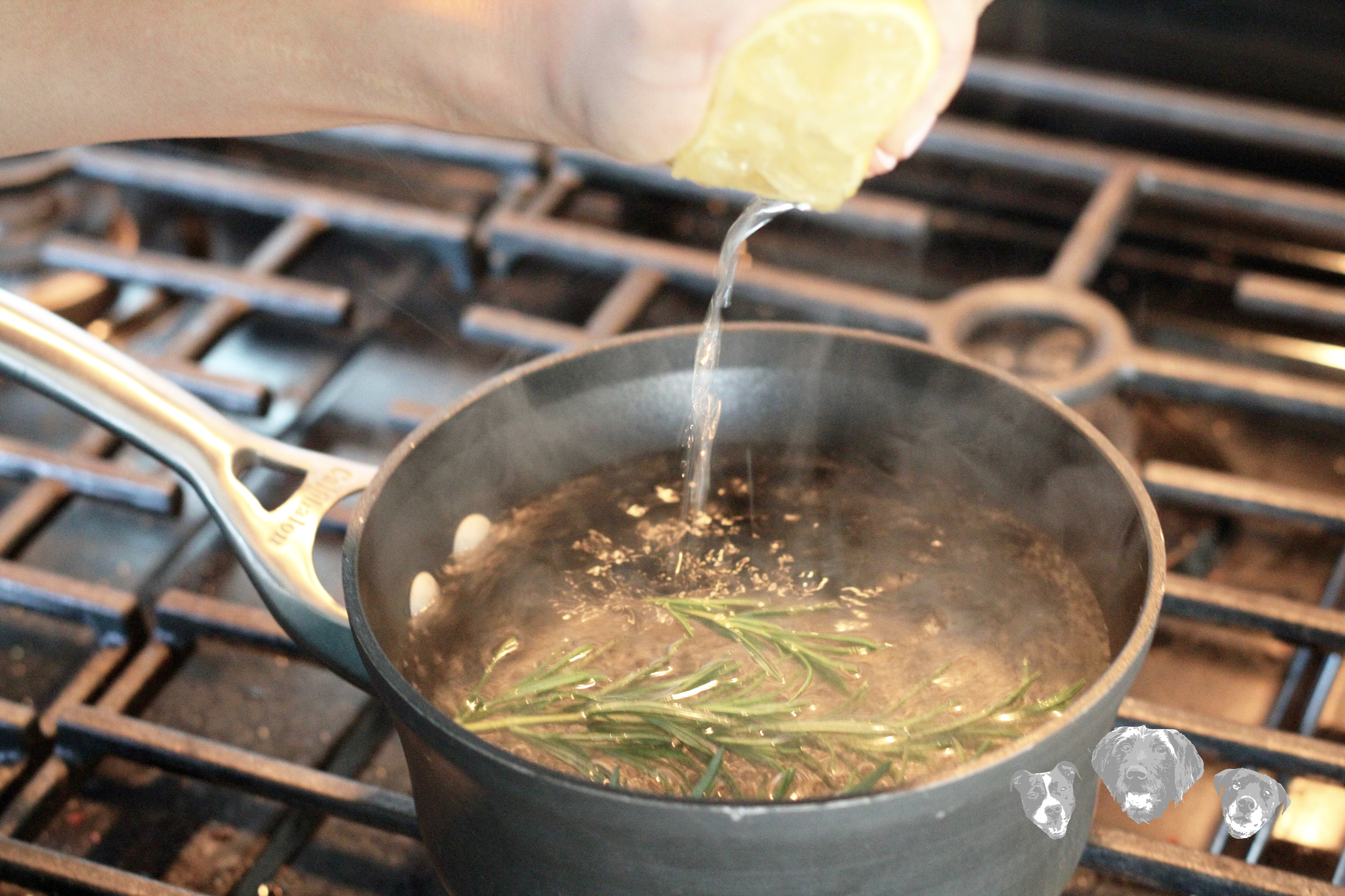 2. Once boiling, add the rosemary sprigs and lemon juice into the boiling water