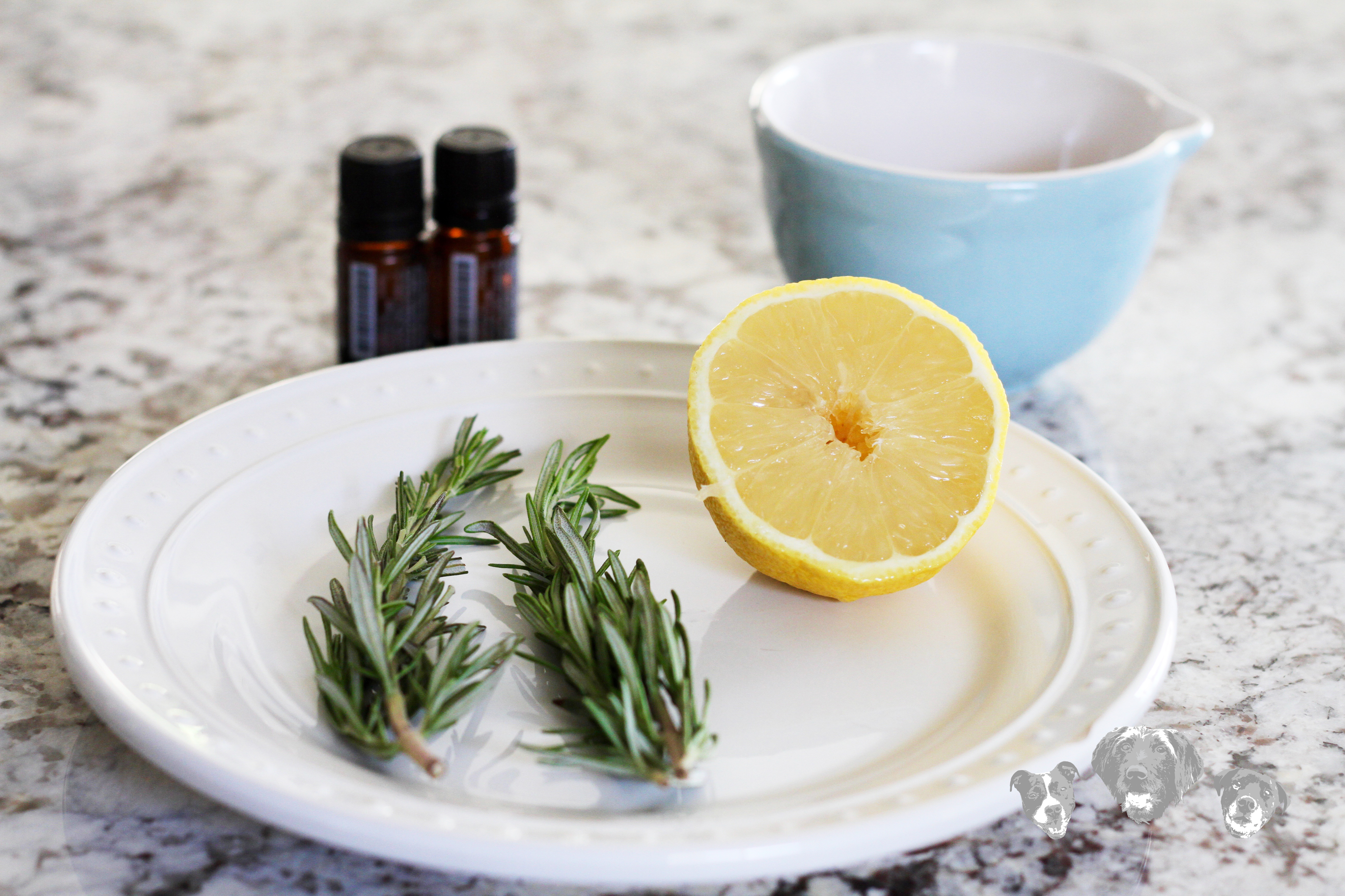 Rosemary is a naturally woody type of herb that deters bugs. Lemon, apple cider vinegar and peppermint are tart and acidic which bugs hate while lavender prevents infestations and is good for skin. Between this spray and my dogs’ heartworm preventative, they are safe from bugs all year round!