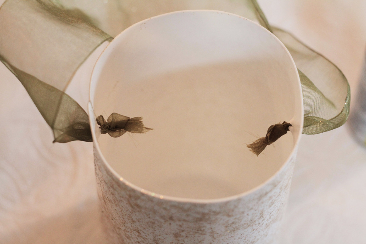 7. String your ribbon on each side from the outside in and tie a knot on the inside of the container. Cut any excess ribbon from your knot