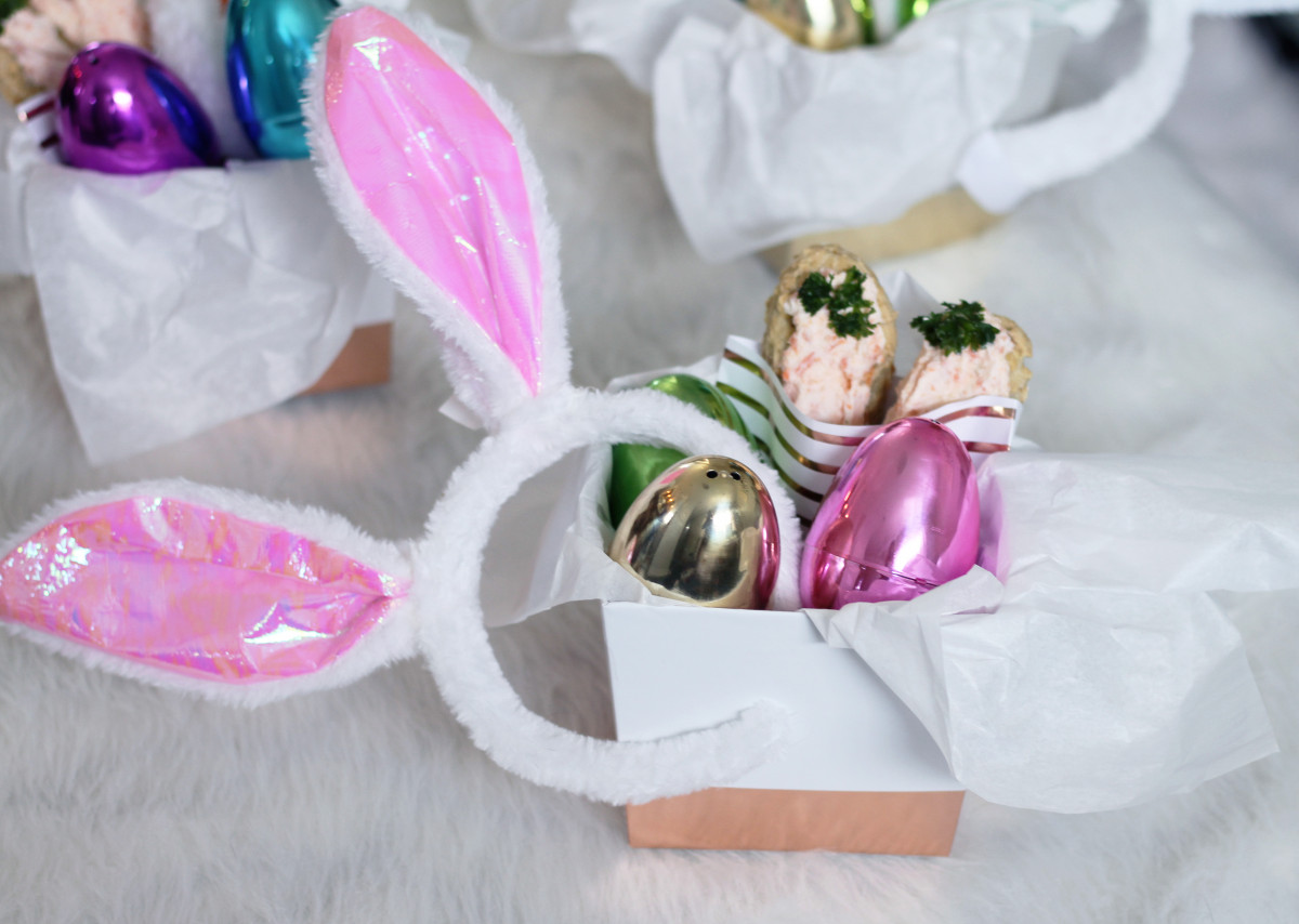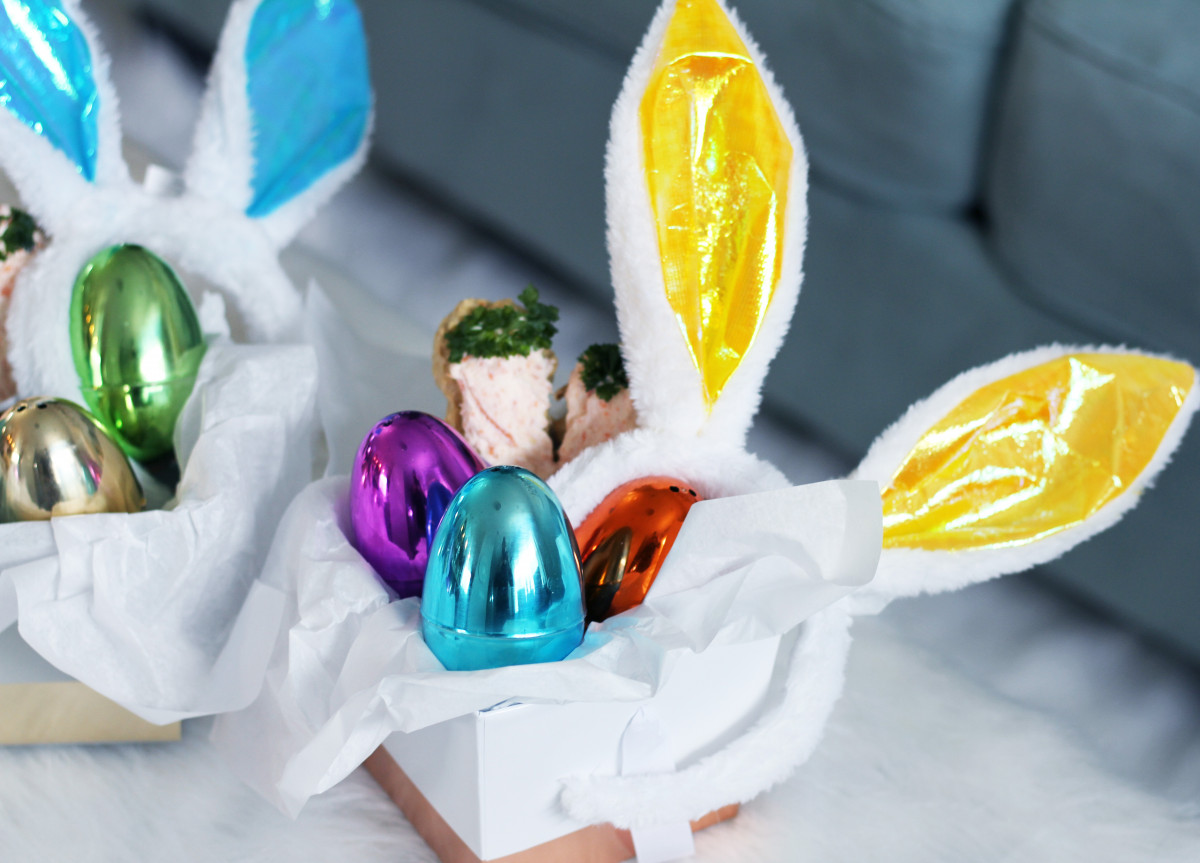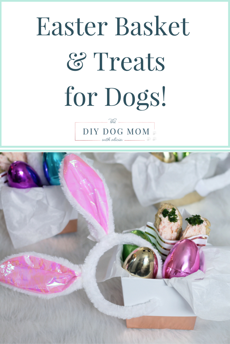 I picked up these adorable large metallic eggs from the Dollar Store- they are connected at the base and had holes so the dogs could smell the treats in them. They were also large enough that the dogs didn’t crunch them in their mouth. I got the baskets and the metallic paper bags for the treats at Target in the dollar section. I added some tissue paper in the bottom of the baskets to boost up the eggs. The bunny ears are also from the Dollar Store. Each basket cost me around $4! I filled the eggs with various smelly treats.