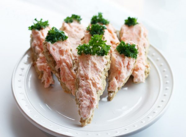 - Once cooled, spread your frosting on top of the treats and add the parsley tops to the top of the treat to make it look like a carrot
