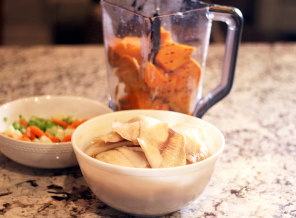 - Place the cooked sweet potatoes and vegetables in a blender and add in the canola oil. Puree until smooth.