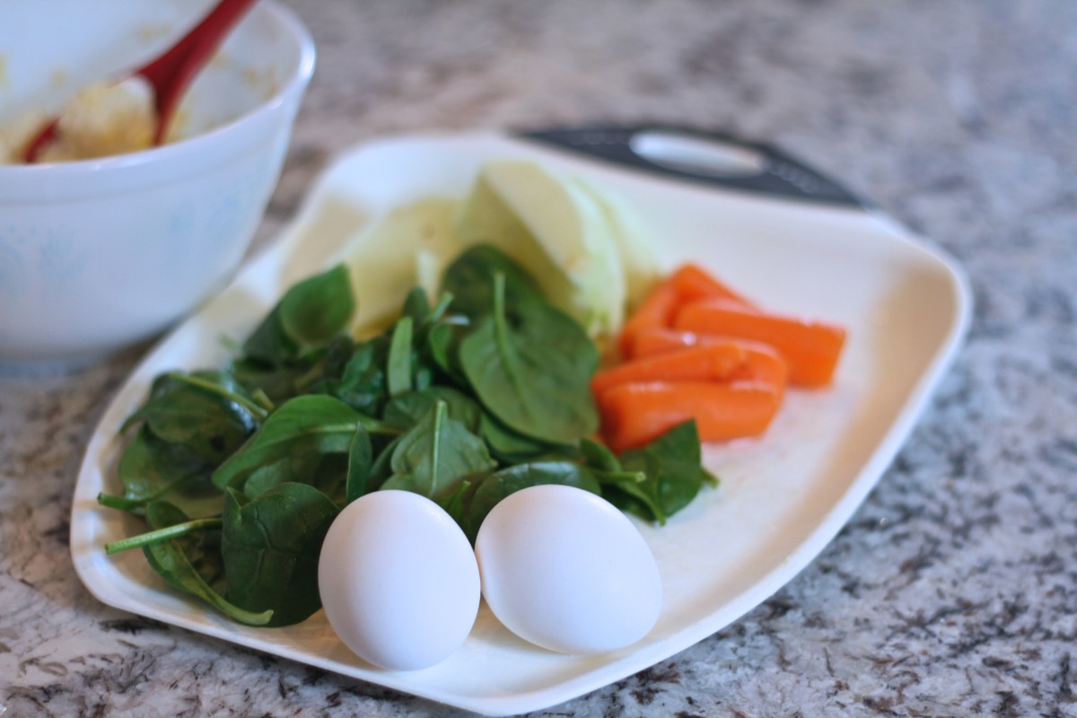 - Mix the pureed apple, spinach and carrots together with the dough until evenly combined